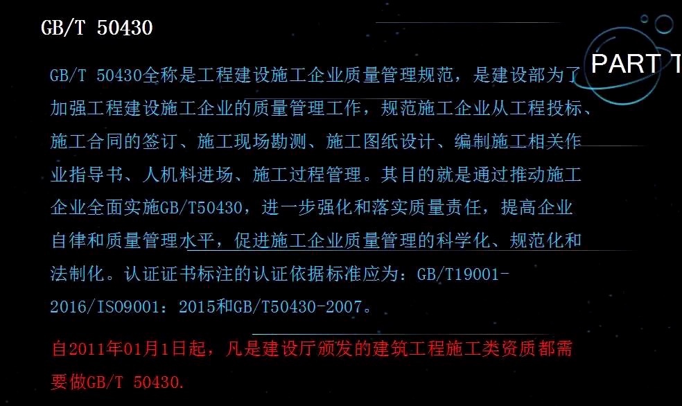 最后,提醒大家一下,GB/T50430-2007建筑施工质量体系是建筑行业的基本资质,在招投标活动中,参加投标活动的企业要具备该资质。